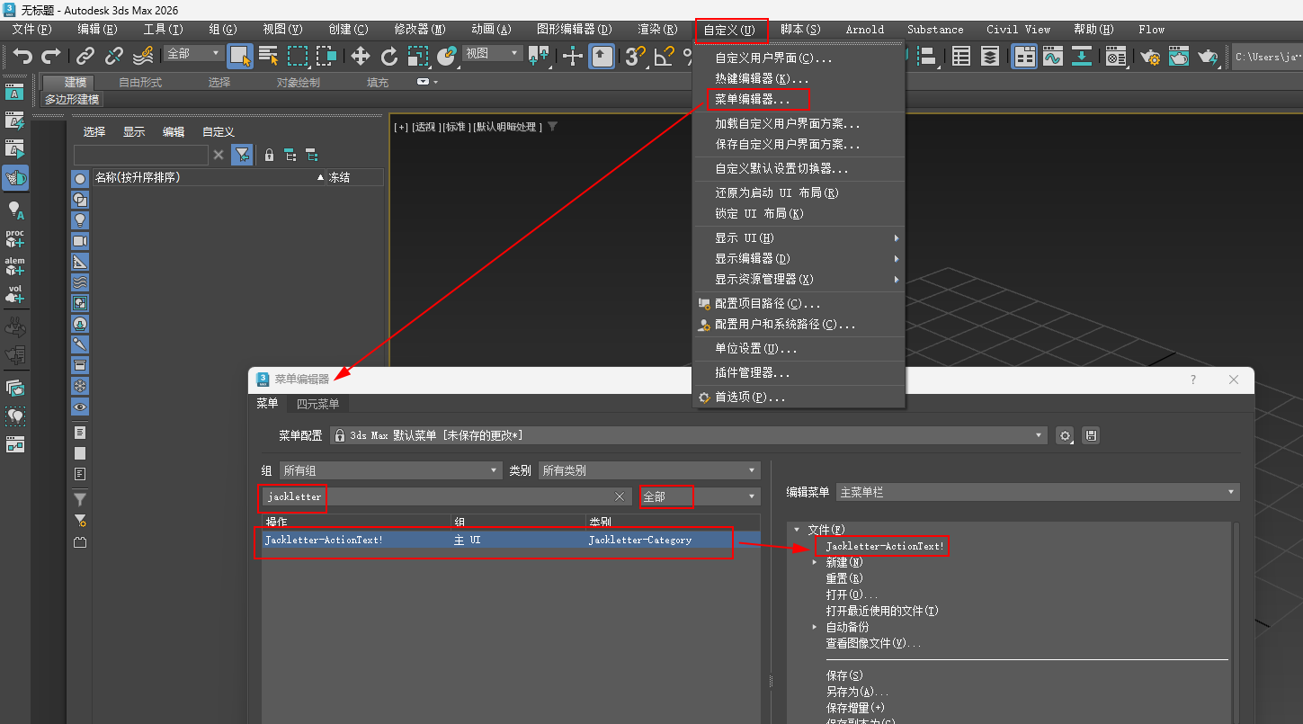 启动后,点击 "自定义"-> "菜单编辑器",在弹出的窗口中搜索 "jackletter"(类别切换成所有类别),会看到下面收到的我们定义的插件信息,将它拖拽到右面,然后点击保存,在弹框提示中选择"保存",我们可以在文件弹出的菜单配置文件保存框中写入自己喜欢的名字(我写的是test),主要步骤看下图: