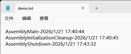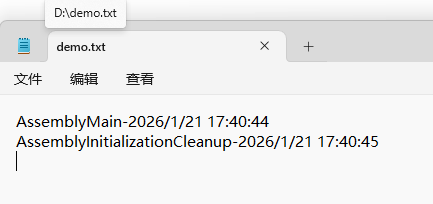 File.AppendAllText("d:\\demo.txt", "AssemblyInitializationCleanup-" + DateTime.Now.ToString() + "\r\n");