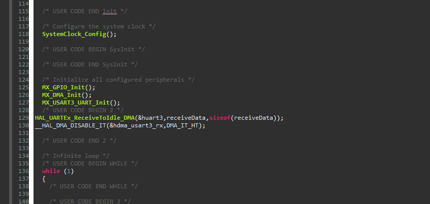 HAL_UARTEx_ReceiveToIdle_DMA(&huart3, receiveData, sizeof(receiveData));