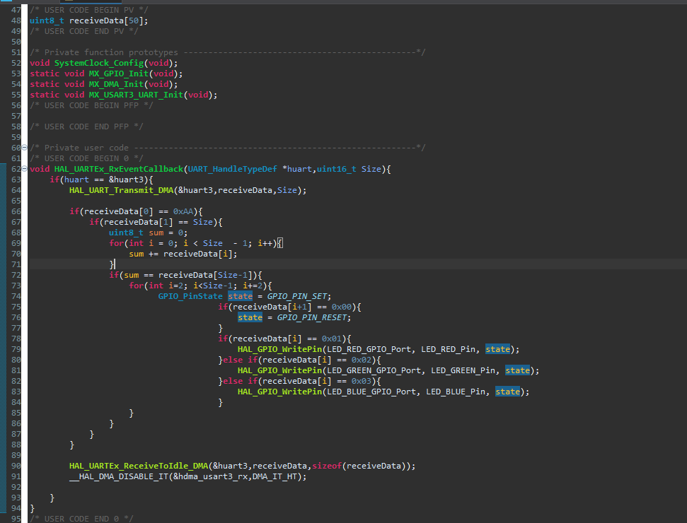 当确认是串口3的回调事件后,立即通过DMA将接收到的数据原封不动发回