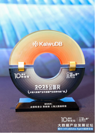 1 月 14 日,由上海市数据局指导,金猿组委会、数据猿、上海市数商协会与上海大数据联盟共同主办的"2025 第八届金猿大数据产业发展论坛暨 AI Infra & Data Agent 趋势论坛"在上海成功举办。论坛现场,2025 年度大数据产业年度榜单正式公布,KaiwuDB 凭借出色的技术实力与市场表现,荣获"2025中国大数据产业年度国产化优秀代表厂商"称号。