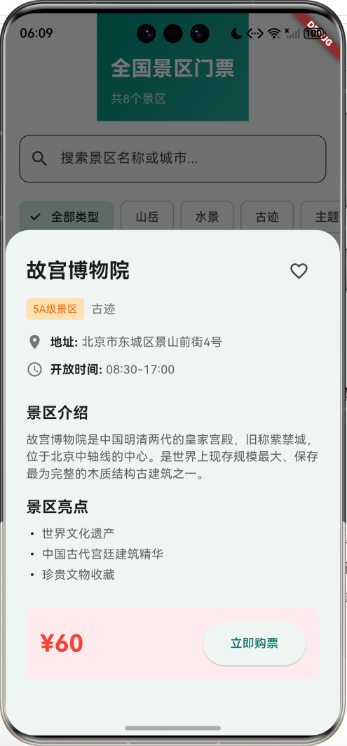 使用ModalBottomSheet展示景区完整信息,包括介绍、亮点、购票按钮等。