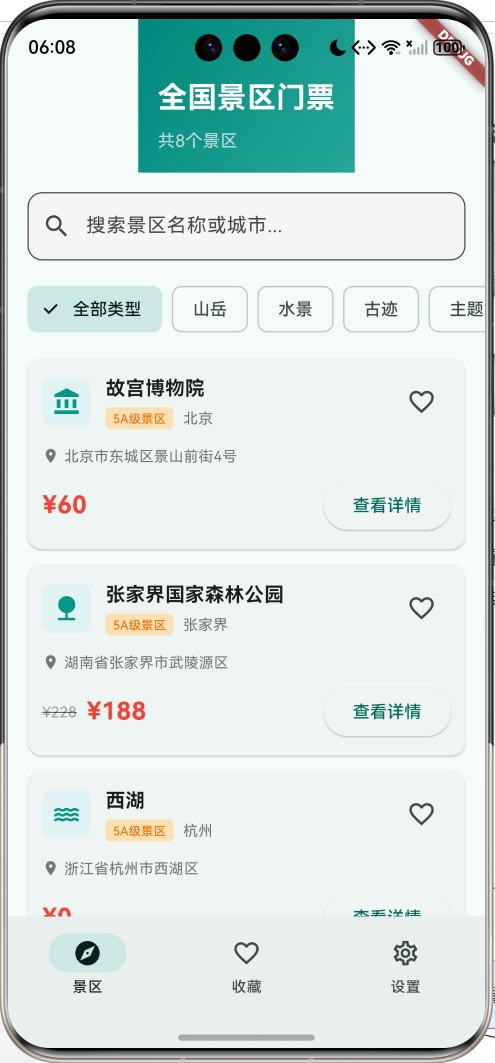 全国景区门票查询是一个简洁实用的Flutter应用,帮助用户快速查找全国各地景区的门票信息。应用提供了景区搜索、分类筛选、收藏管理等功能,让用户轻松规划旅游行程。
