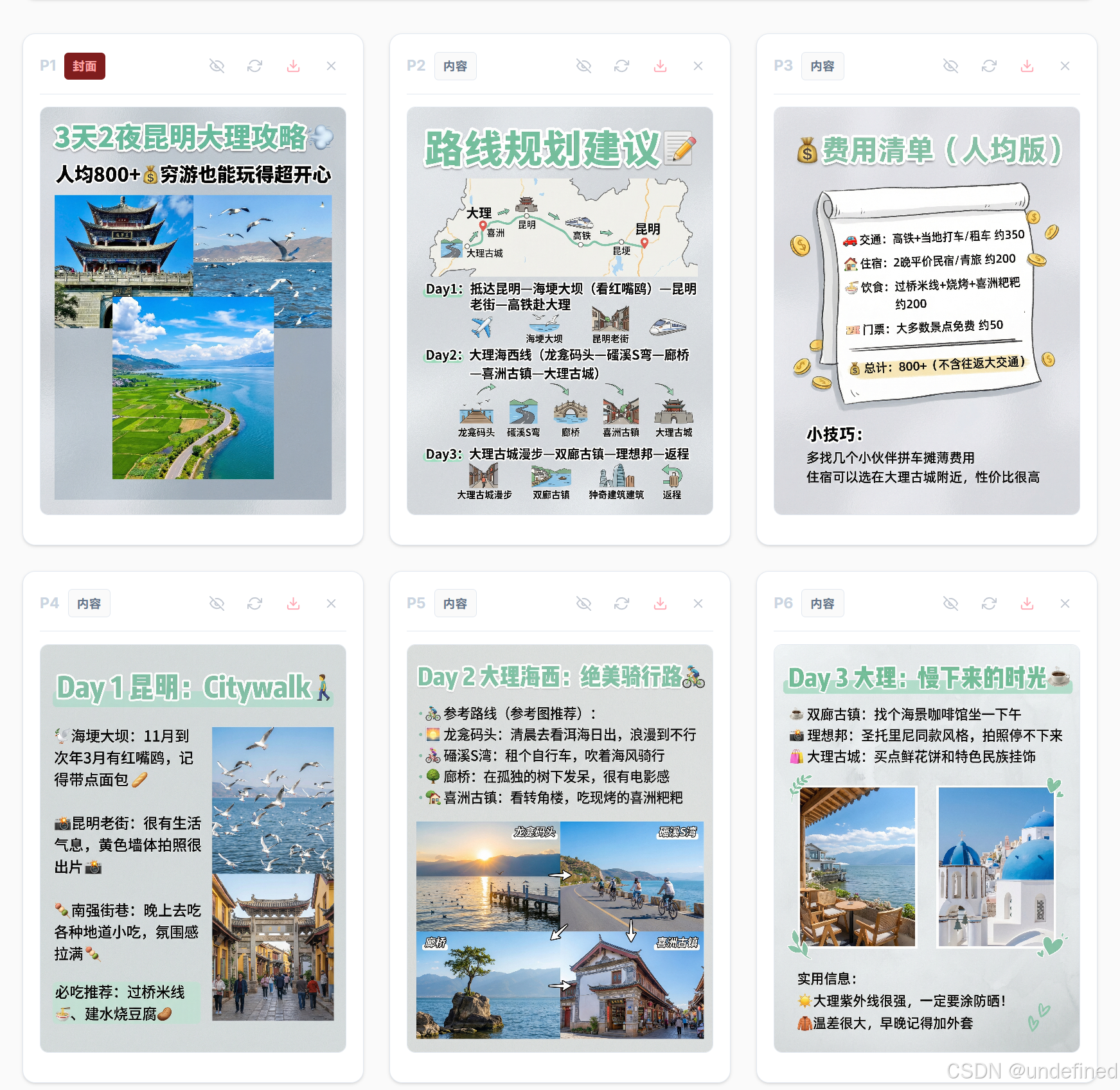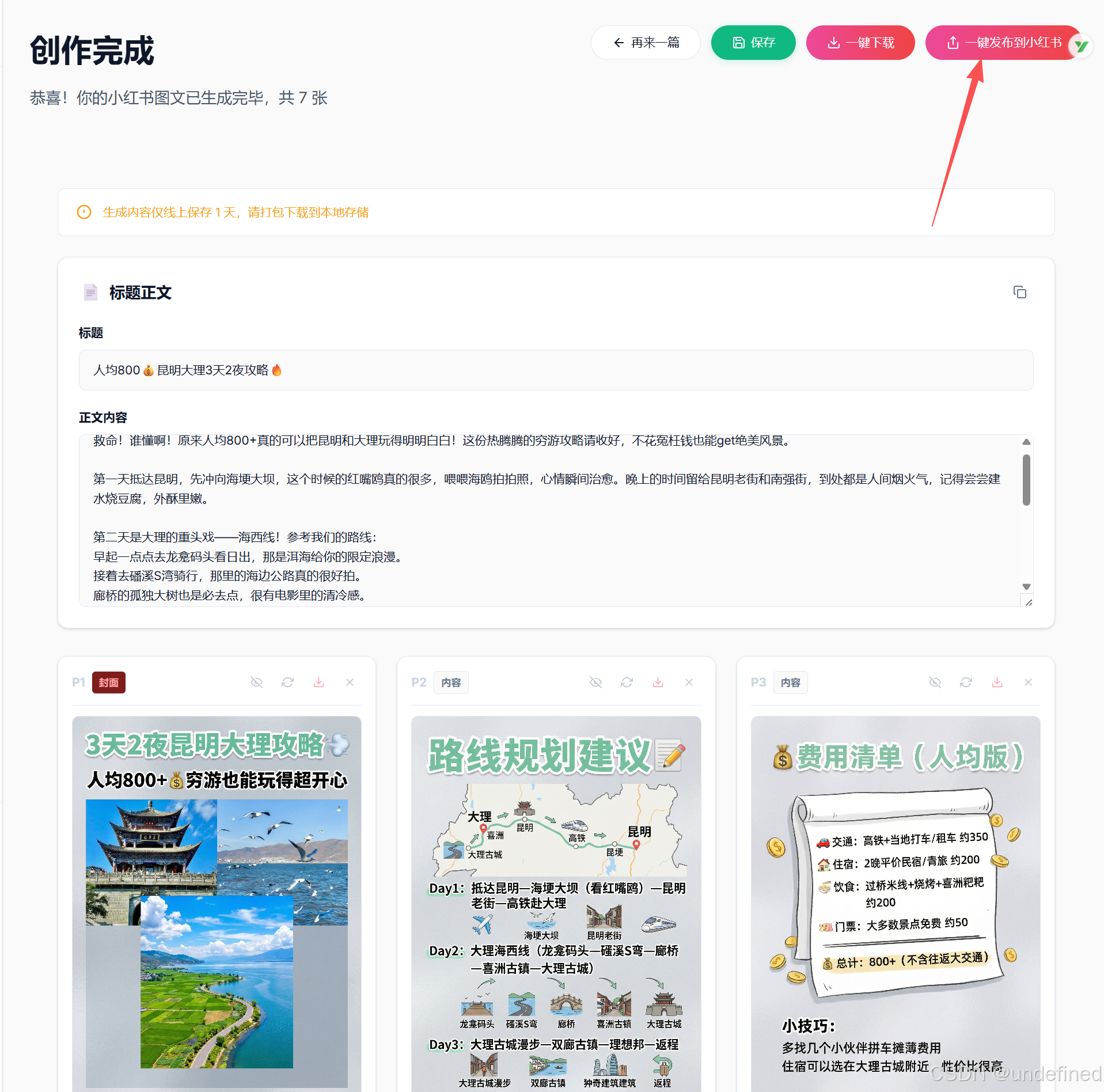 点击生成,系统会直接产出成套的图文素材。这些图片不仅构图专业,更重要的是它们自带"流量相",完全符合 2026 年用户的审美趋势。