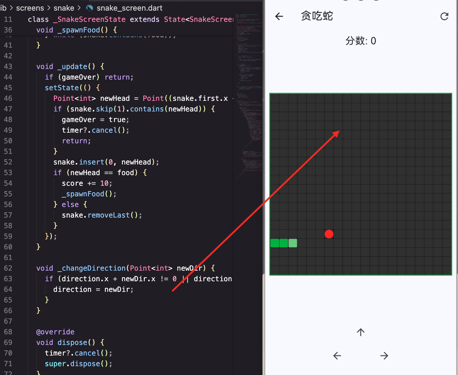 snake.contains(food)检查food是否在snake列表中。Point类重写了==运算符,所以可以正确比较。