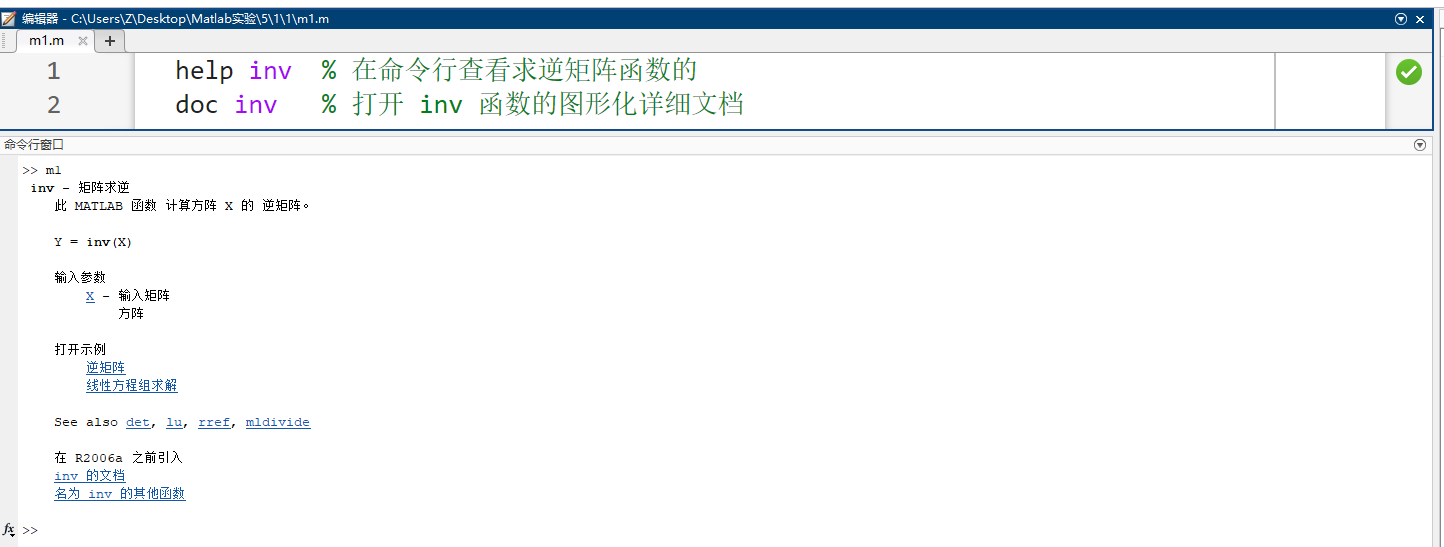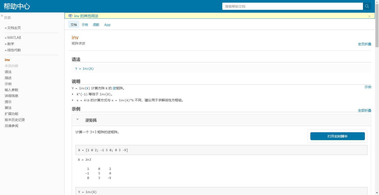 matlabhelp inv % 在命令行查看求逆矩阵函数的用法 doc inv % 打开 inv 函数的图形化详细文档 -
