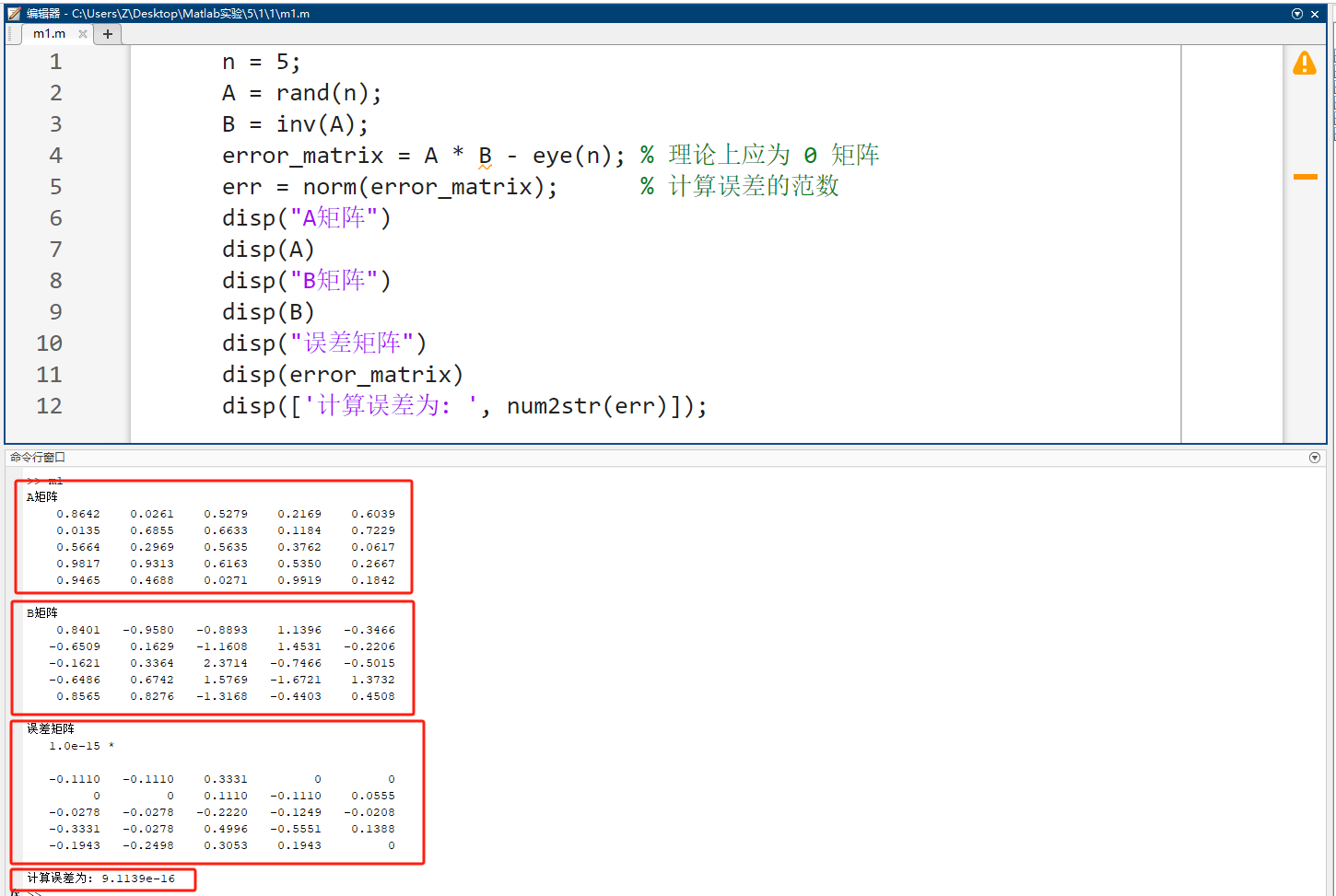 matlabn = 5; A = rand(n); B = inv(A); error_matrix = A * B - eye(n); % 理论上应为 0 矩阵 err = norm(error_matrix); % 计算误差的范数 disp("A矩阵") disp(A) disp("B矩阵") disp(B) disp("误差矩阵") disp(error_matrix) disp(['计算误差为: ', num2str(err)]); -