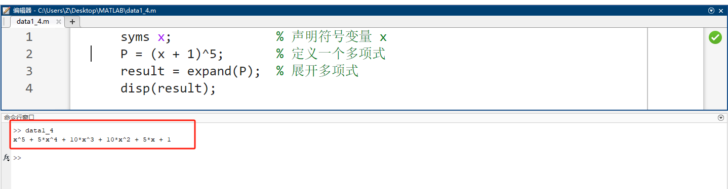 matlabsyms x; % 声明符号变量 x P = (x + 1)^5; % 定义一个多项式 result = expand(P); % 展开多项式 disp(result); -