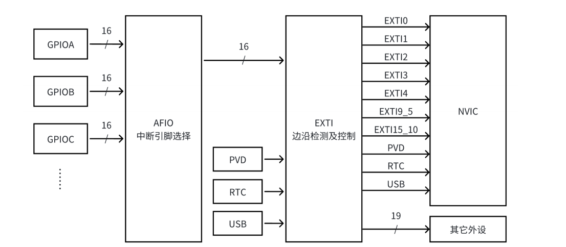 • EXTI 提供了16 个 GPIO_Pin 的中断线 ,以及额外的中断线如 PVD 输出、RTC 闹钟 、USB 唤醒和以太网唤醒。(注意只有互联网芯片才有以太网)。