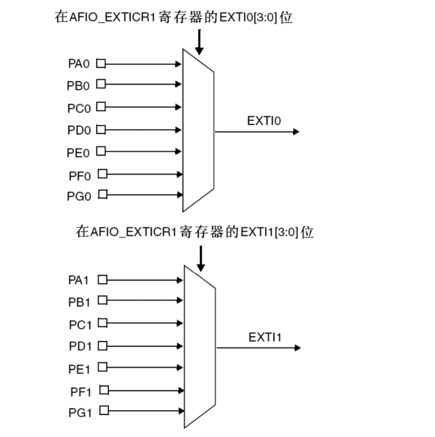 • EXTI 支持所有的GPIO口,但需要注意的是,相同的 Pin 不能同时触发中断。例如,PA0 和 PB0 不能同时被 配置为中断源。