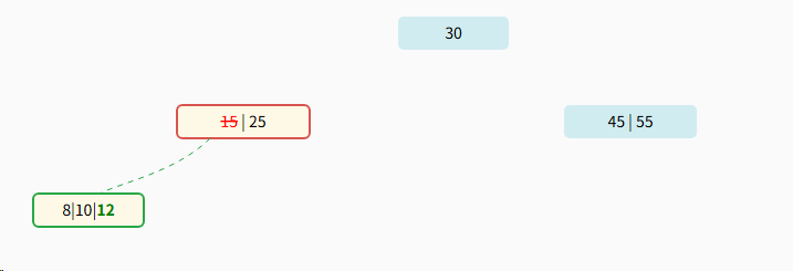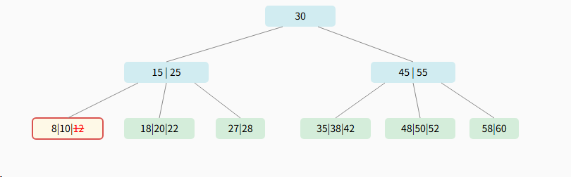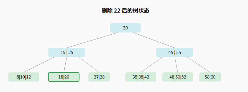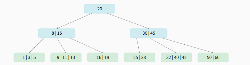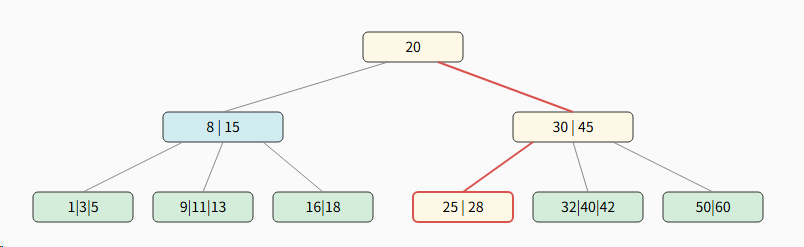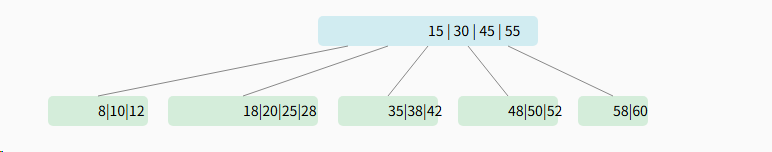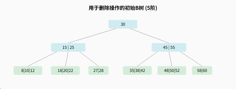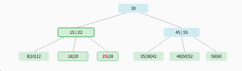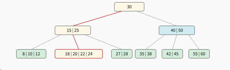 - 每个节点最少2个关键字(⌈5/2⌉-1 = 3-1 = 2),根节点除外