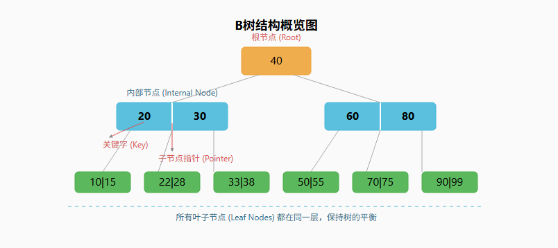B树通过构建一棵"矮胖"的树,完美地实践了这一哲学。它的每个节点可以存储大量的关键字和指向子节点的指针。这样一来,树的高度被极大地压缩,从根节点到任何叶子节点的路径都非常短,从而显著减少了磁盘IO的次数。