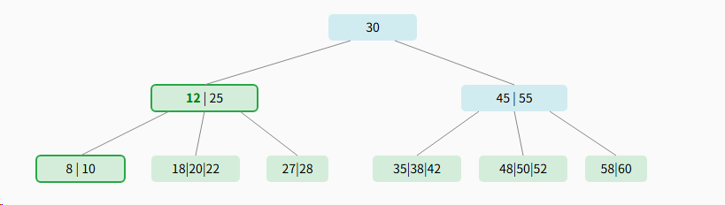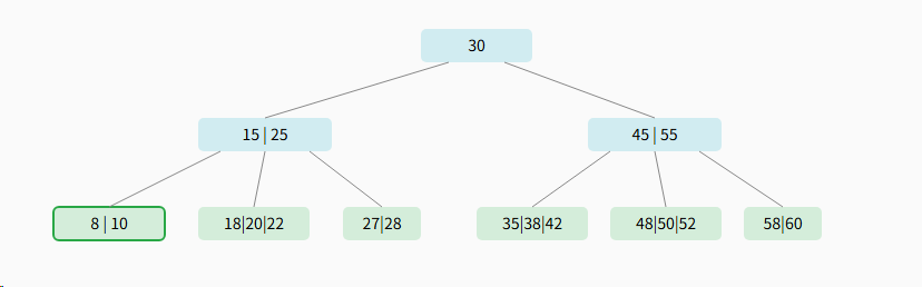 - 结束条件: 重复以上过程,直到在某个节点中成功找到关键字,或者到达了叶子节点但仍然没有找到(这意味着该关键字在树中不存在)。