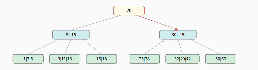 在内存中比较:因为 42 > 20, 所以选择右侧指针继续查找。