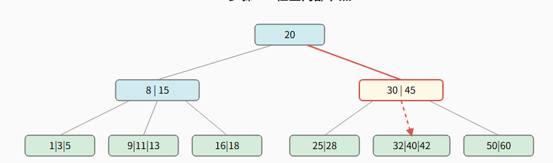 第三次磁盘 I/O, 读取叶子节点 [32 | 40 | 42] 到内存。