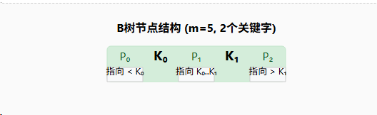 [K₁, K₂, ..., Kₖ],它将有k+1个子节点指针[P₀, P₁, ..., Pₖ]。这些指针所指向的子树中的关键字范围被严格限定:P₀指向的子树中所有关键字都 **小于K₁。- 对于