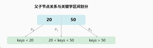 父节点的关键字就像"路牌",把数据划分到不同的区间。要查找 35,因为 20 < 35 < 50,所以会沿着 P₁ 指针去中间的子节点继续查找。