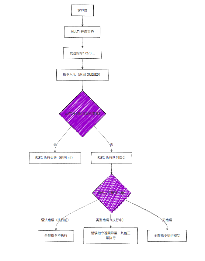 - EXEC 后失败:指令逻辑错误(如对 String 执行 LPOP),仅该指令返回错误,其他指令正常执行;