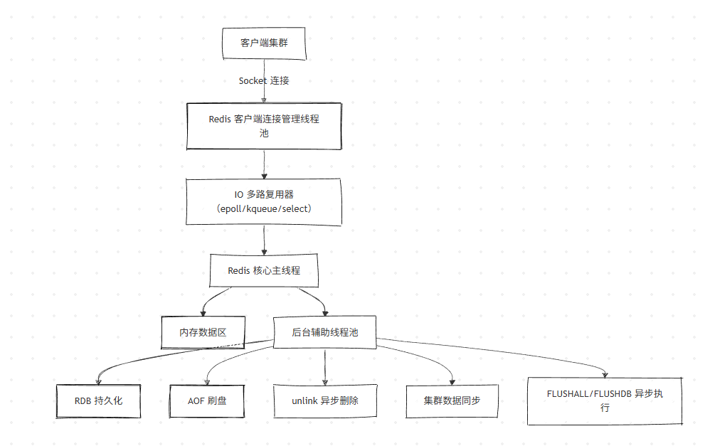 - 耗时操作使用多线程:RDB 生成、AOF 重写 / 刷盘、unlink 异步删除、集群数据同步、FLUSHALL/FLUSHDB 异步执行等,由独立线程处理,避免阻塞核心主线程;