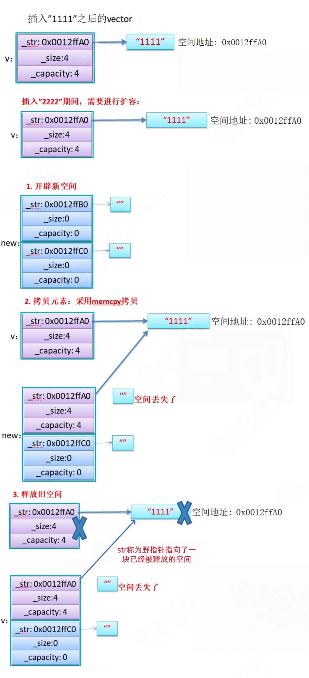 注意:扩容后,原容器的迭代器 / 指针会失效,这是 vector 的特性