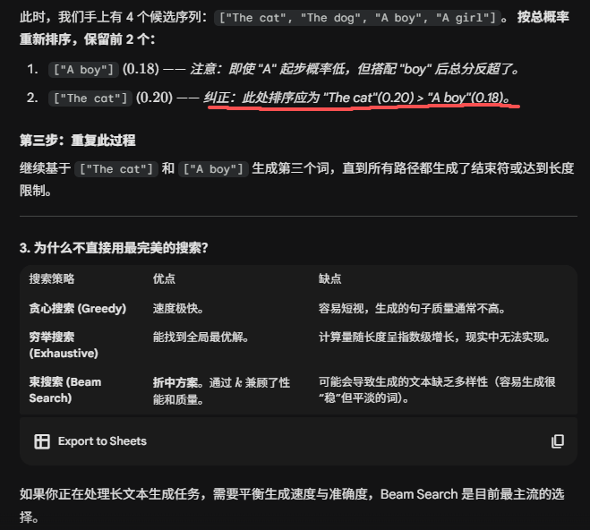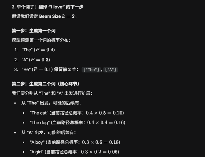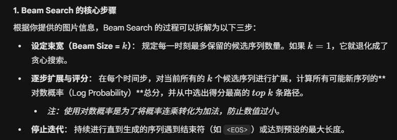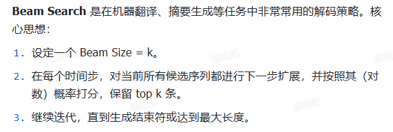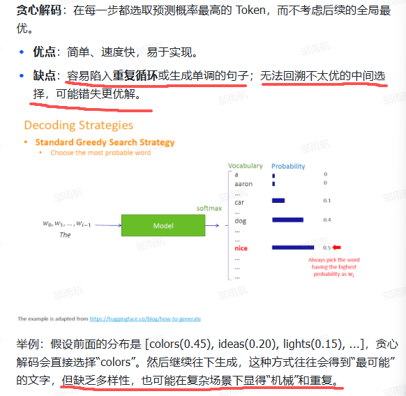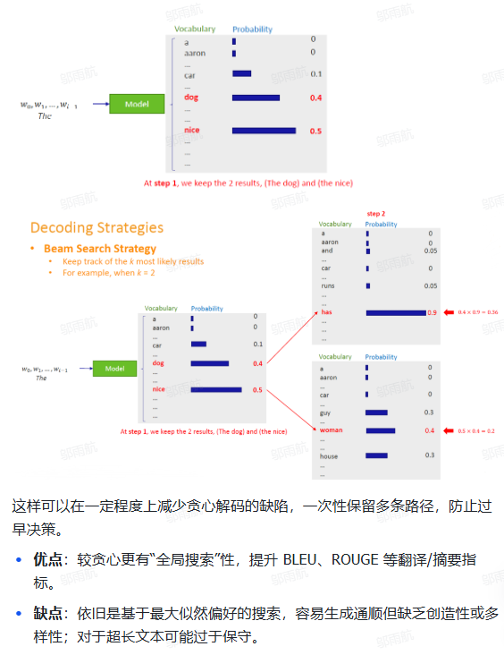 - 缺点: 缺乏多样性,无法回溯其他选择、容易陷入局部最优 (错过整体概率更高的句子)、容易陷入重复循环、不通顺。