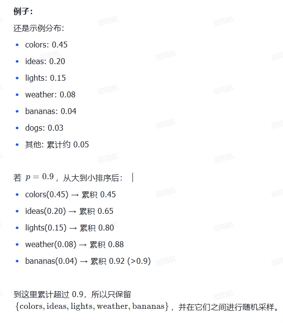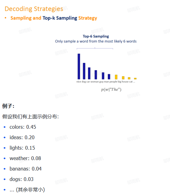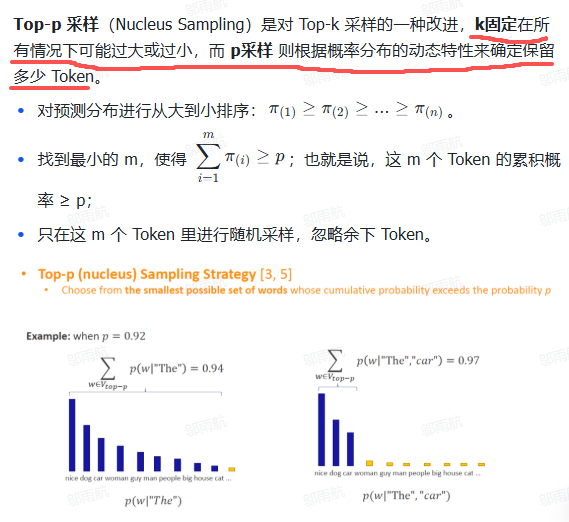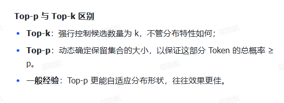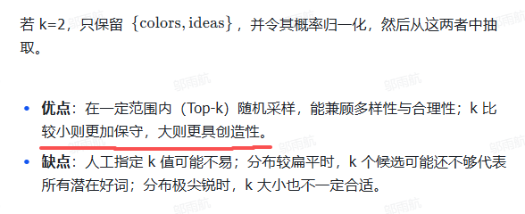 概述: Top-K采样是随机采样的一种优化策略。每个时间步,只保留概率最高的k个Token ,让模型只在这k个候选里进行随机抽取。与贪心解码(相当于k=1)相比,更能避免一味选最热门候选导致的重复或过度保守,也减少了从非常罕见词采样的风险。
