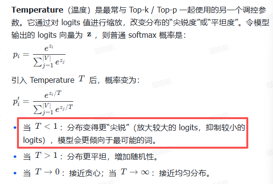Temperature (温度) 是最常与 Top-k / Top-p 一起使用的另一个调控参数。它通过对 logits 值进行缩放,改变分布的 "尖锐度" 或 "平坦度" 。令模型输出的 logits 向量为 z ,则普通 softmax 概率是: