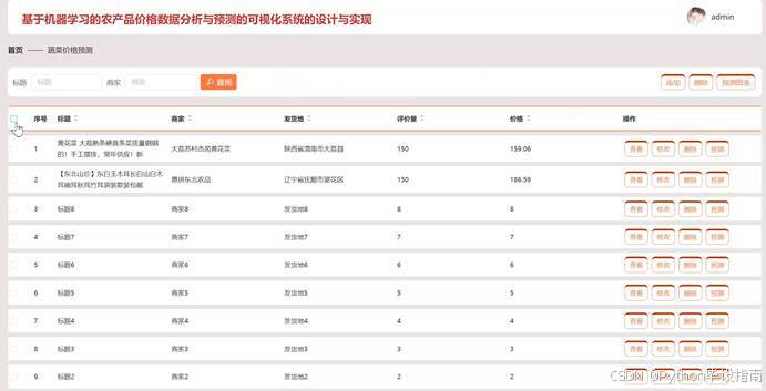 在"蔬菜价格预测管理"模块中,管理员可输入标题或商家进行查询,快速定位相关蔬菜信息。支持添加新蔬菜信息,并通过爬虫技术从指定数据源抓取最新价格数据。系统利用机器学习算法(如ARIMA、LSTM等)对历史数据进行分析,生成预测图表。管理员可查看、修改或删除蔬菜价格预测的详细信息,确保数据的准确性和时效性;蔬菜价格预测管理如图5-7所示: