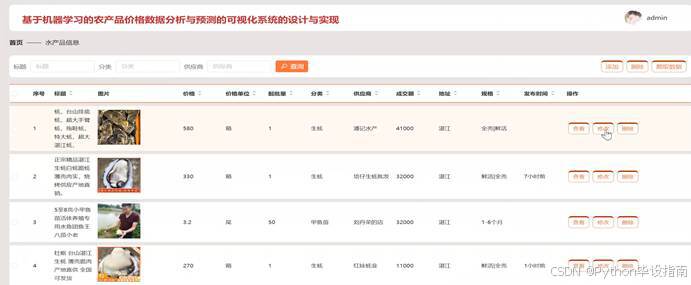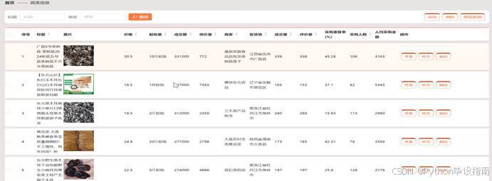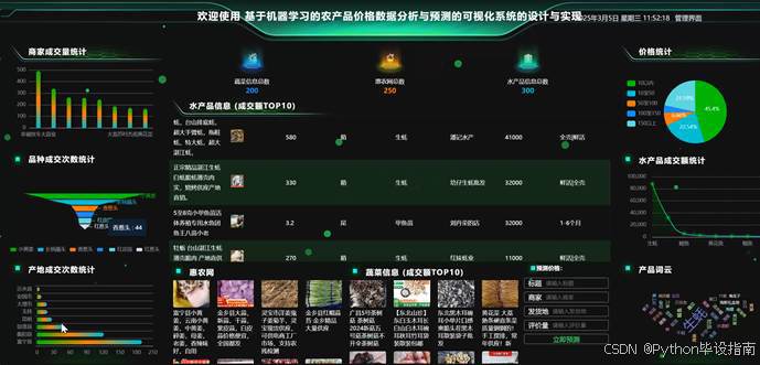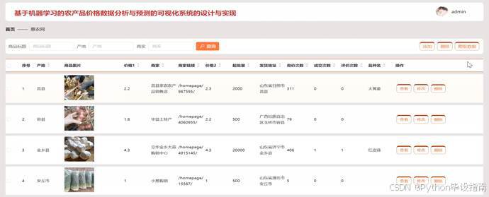 - 数据采集模块:定时从"惠农网"等目标网站爬取农产品(蔬菜、水产等)的名称、价格、产地、销量、商家信息等数据。