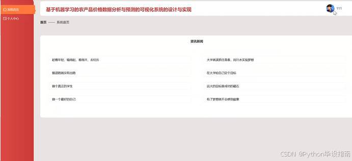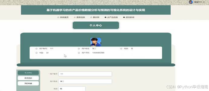 用户主页简洁明了,包含"系统首页"和"个人中心"两大核心功能。系统首页为用户提供农产品价格动态、市场趋势等关键信息的实时展示,帮助用户快速把握市场情况。个人中心则提供个性化服务,用户可在此修改个人信息、密码,管理收藏内容,满足个性化需求。用户主页界面如图5-9所示: