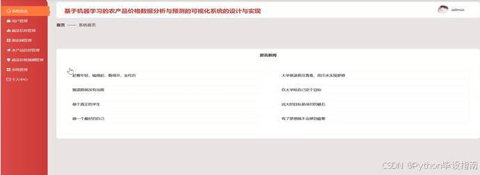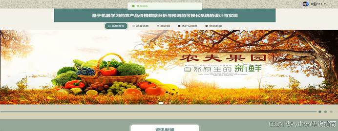 本系统前台功能模块设计以用户需求为导向,提供全面且便捷的服务。系统首页为用户提供农产品价格的总览,展示当前市场动态和关键指标。蔬菜信息模块和水产品信息模块分别提供相关农产品的详细价格走势、产地信息及市场供需情况。惠农网模块则整合惠农网数据,为用户呈现更广泛的市场信息。资讯新闻模块实时更新农业行业动态,帮助用户把握市场趋势。系统首页页面如图5-1所示: