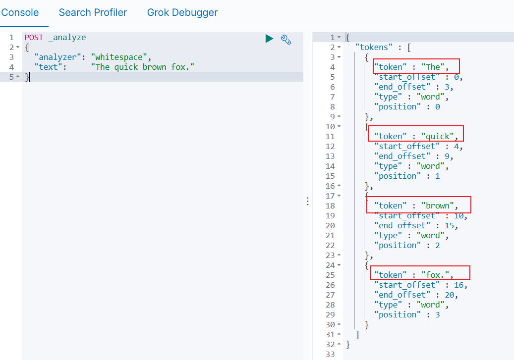 whitespace 分词器一遇到空白字符,就会将文本分解成各个词素。