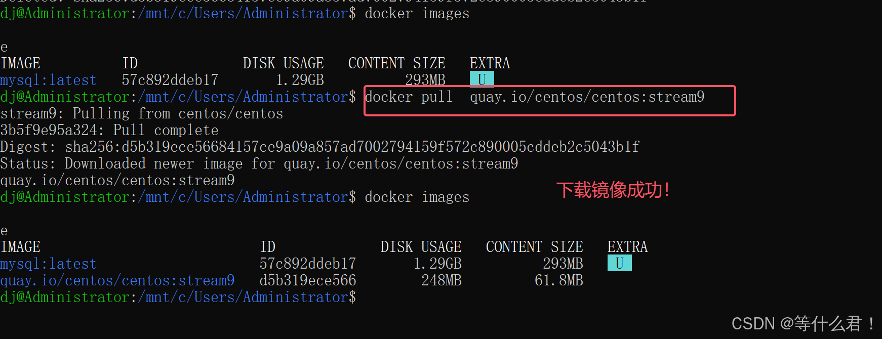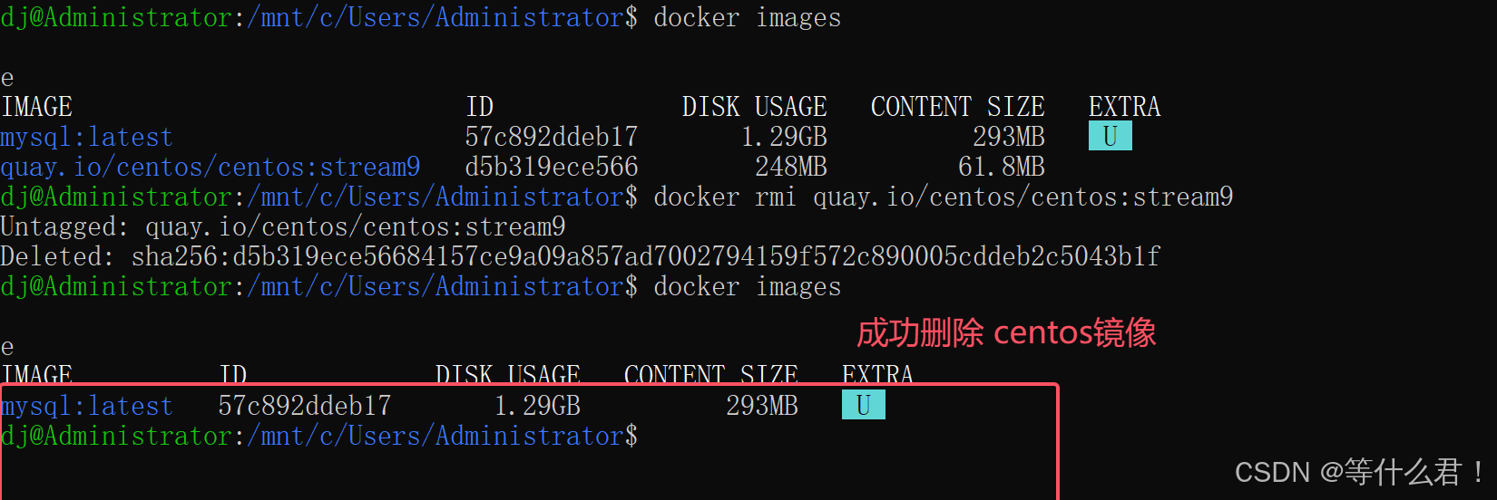从下面这个图片可知,centos镜像被删除了,我将从docker远程仓库 重新 拉取