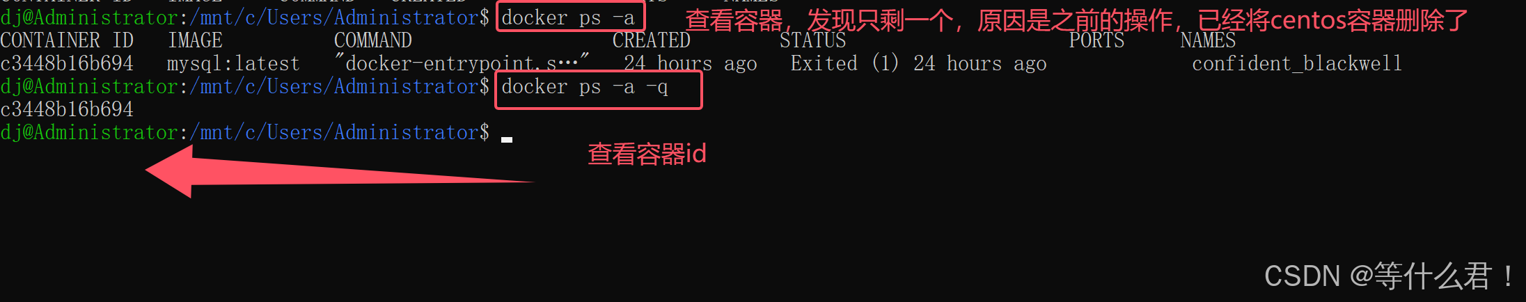 注意:这个命令的主要用途是生成一个纯容器 ID 的列表,方便作为参数传递给其他命令(比如 docker rm、docker stop),实现批量操作。