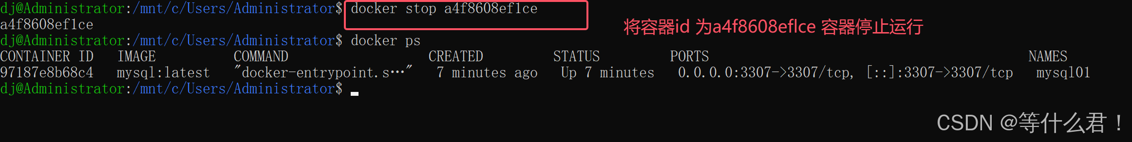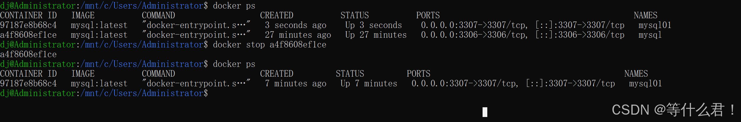 如图所示:其中一个mysql 容器已经被我通过docker stop 命令 停止运行了。现在我想让容器id 为