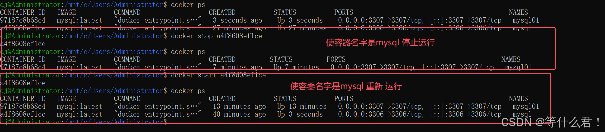 区别于 docker run:docker run 是新建并启动容器,docker start 是启动已存在的容器。