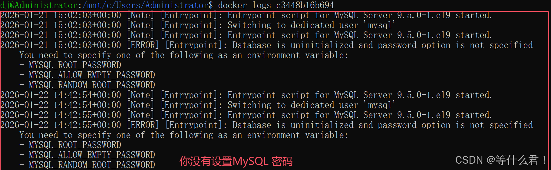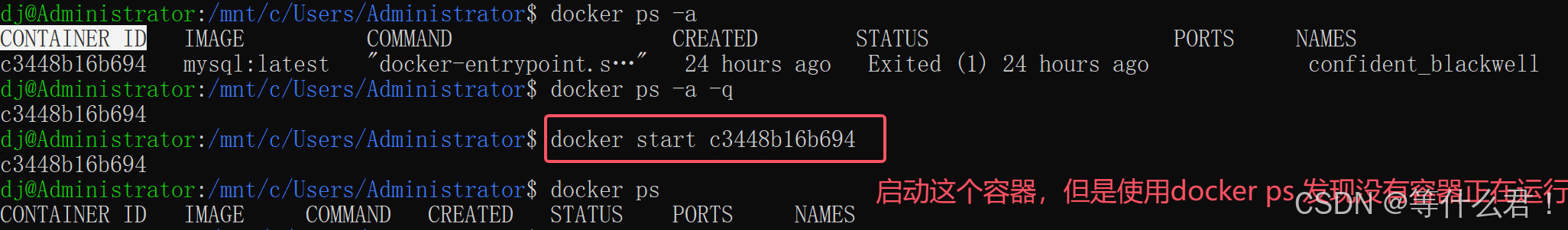 示例:我使用docker start 容器id,启动容器,并且成功返回容器的id,但是我使用docker ps 发现么有正在运行的容器,于是使用 docker logs 容器id 查看该容器是什么情况