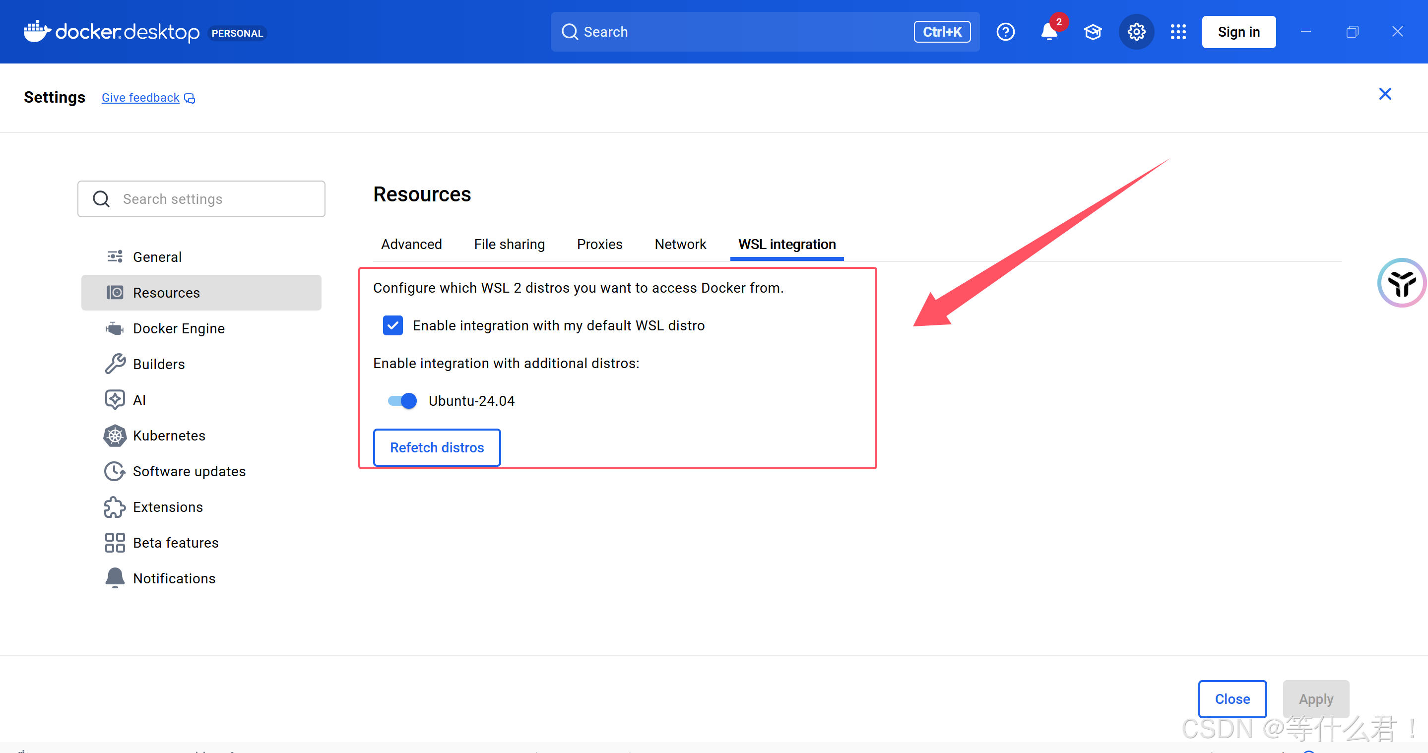 如果输入wsl,报错,重新点击 下载的docker 找到 resource 配置,看到集成wsl,重新打开【即使之前是打开的,为防止意外,建议重新操作一遍】