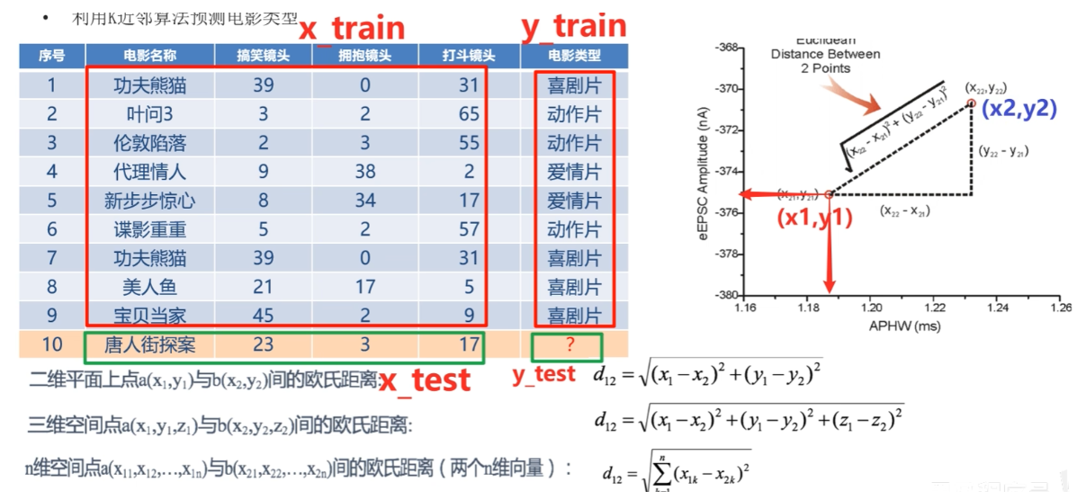如何判断唐人街的电影类型,算点与其余例子的欧氏距离,算k=5时,找到最相近的电影类别,来决定10号电影的类别。