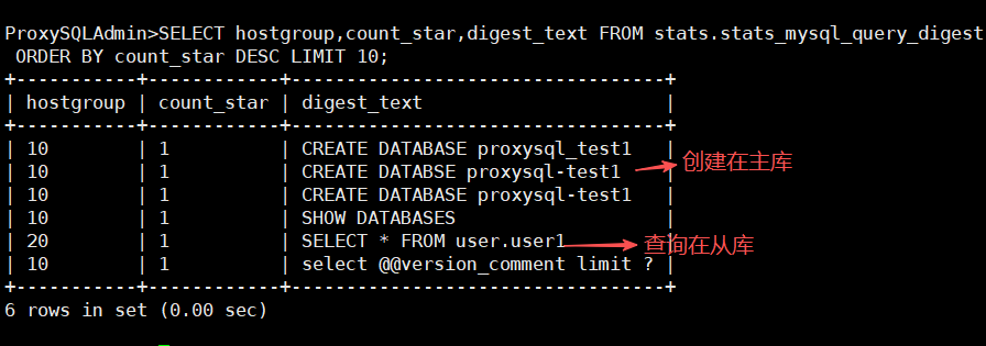 SELECT hostgroup,count_star,digest_text FROM stats.stats_mysql_query_digest ORDER BY count_star DESC LIMIT 10;