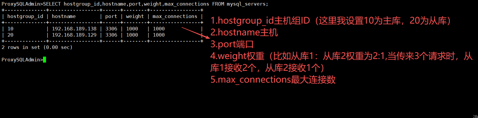INSERT INTO mysql_servers(hostgroup_id,hostname,port,weight,max_connections) VALUES (10,'192.168.189.138',3306,1000,1000);