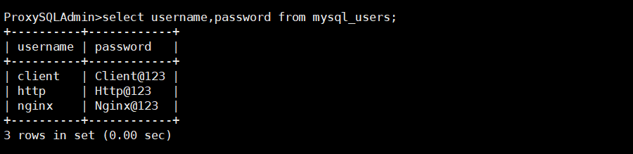 定义应用程序连接 ProxySQL 时使用的用户名和密码。这些用户必须在后端 MySQL 服务器上真实存在。