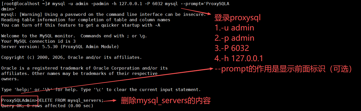 mysql -u admin -padmin -h 127.0.0.1 -P 6032 --prompt='ProxySQLAdmin>'