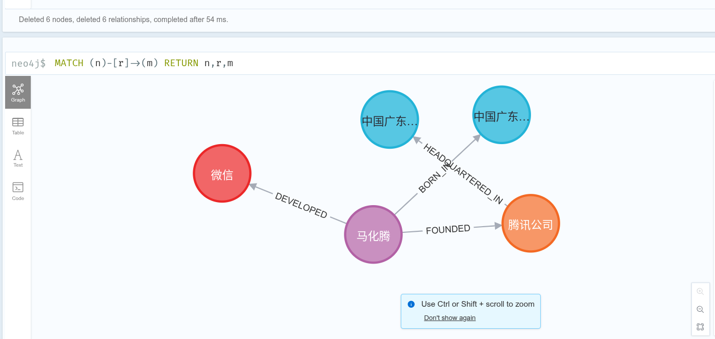 - DEVELOPED:A 开发了 B(例:张小龙 --DEVELOPED--> 微信)