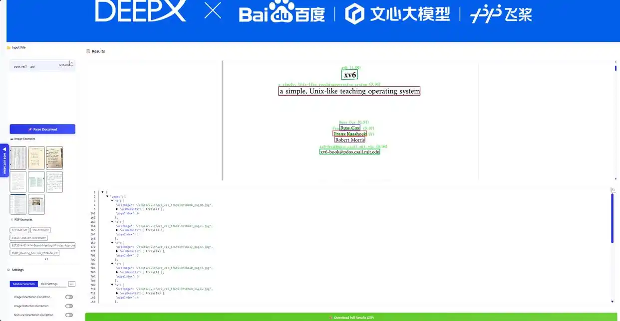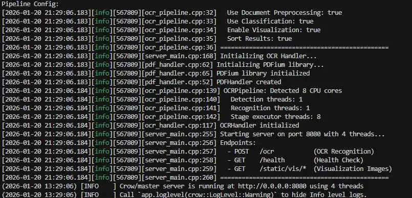 DeepX OCR Server 基于 Crow 高性能 HTTP 框架构建,支持并发请求处理、图像与 PDF 文件输入,可直接作为后端服务集成到业务系统中。