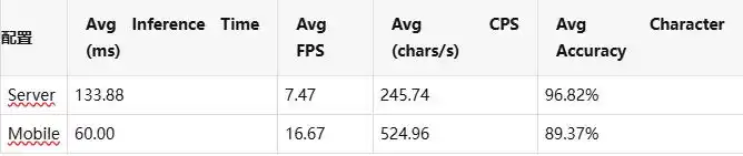 Mobile 配置在边缘设备上展现出更高的吞吐能力与更低的推理时延,适用于实时采集、多路输入等场景;而 Server 配置则更侧重字符识别精度,适合关键字段识别与高精度校验类业务。
