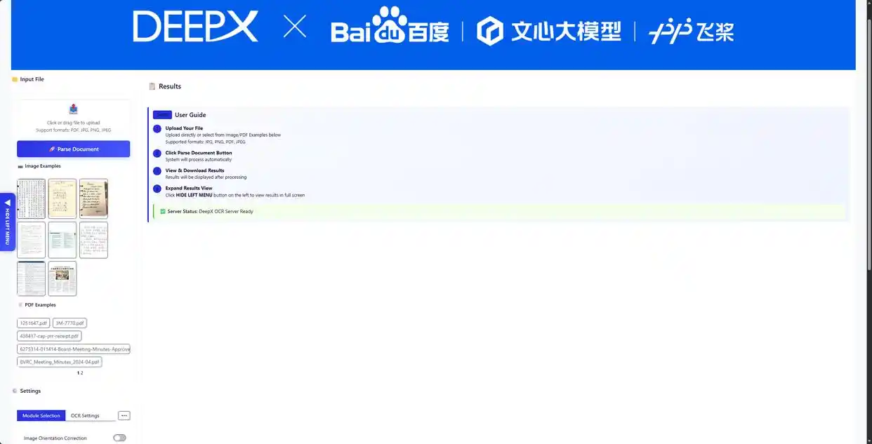 在性能评测与工程验证之外,DeepX OCR 同时提供 WebUI Demo 作为配套的体验与验证服务。通过 WebUI,用户可以从实际输入出发,直观感受 DeepX NPU 加速下 PaddleOCR 的完整推理流程。