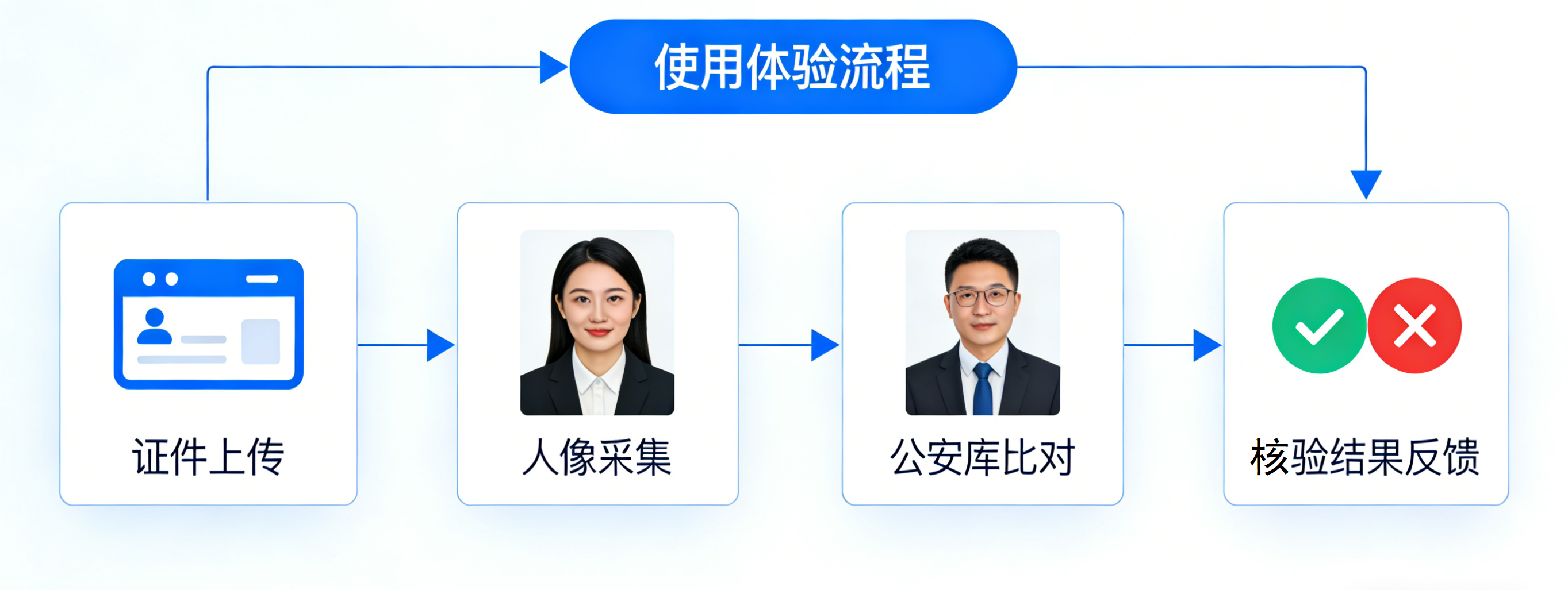 - 实时核验:系统自动完成证件读取、活体检测与人脸比对;
