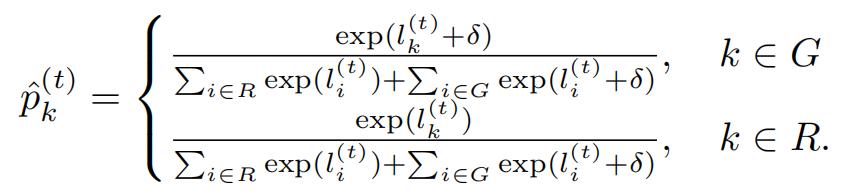 - 应用偏置 δ \delta δ 到绿列表每个词元对应的逻辑值,并计算修改后的概率分布。