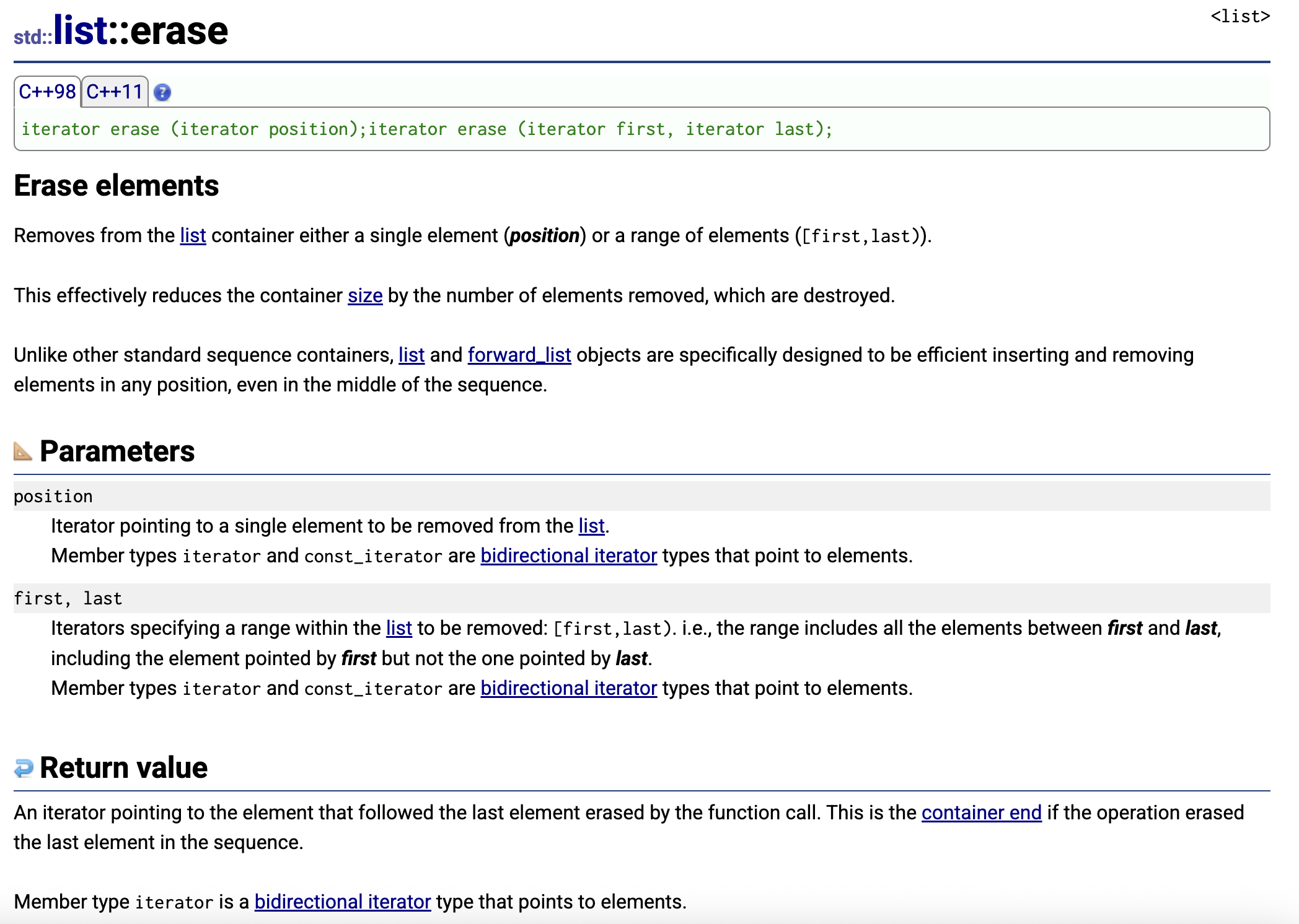 调整前驱/后继指针,释放当前节点,size-1,返回下一个节点迭代器; |